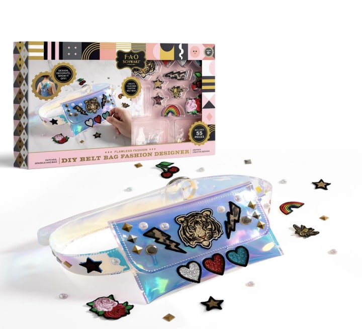 The hereafter fashion designer is definitely going to love this gift. Information technology comes with everything they need to make their very own belt pocketbook, including adorable glue-on embroidered patches and gilt and silver studs.